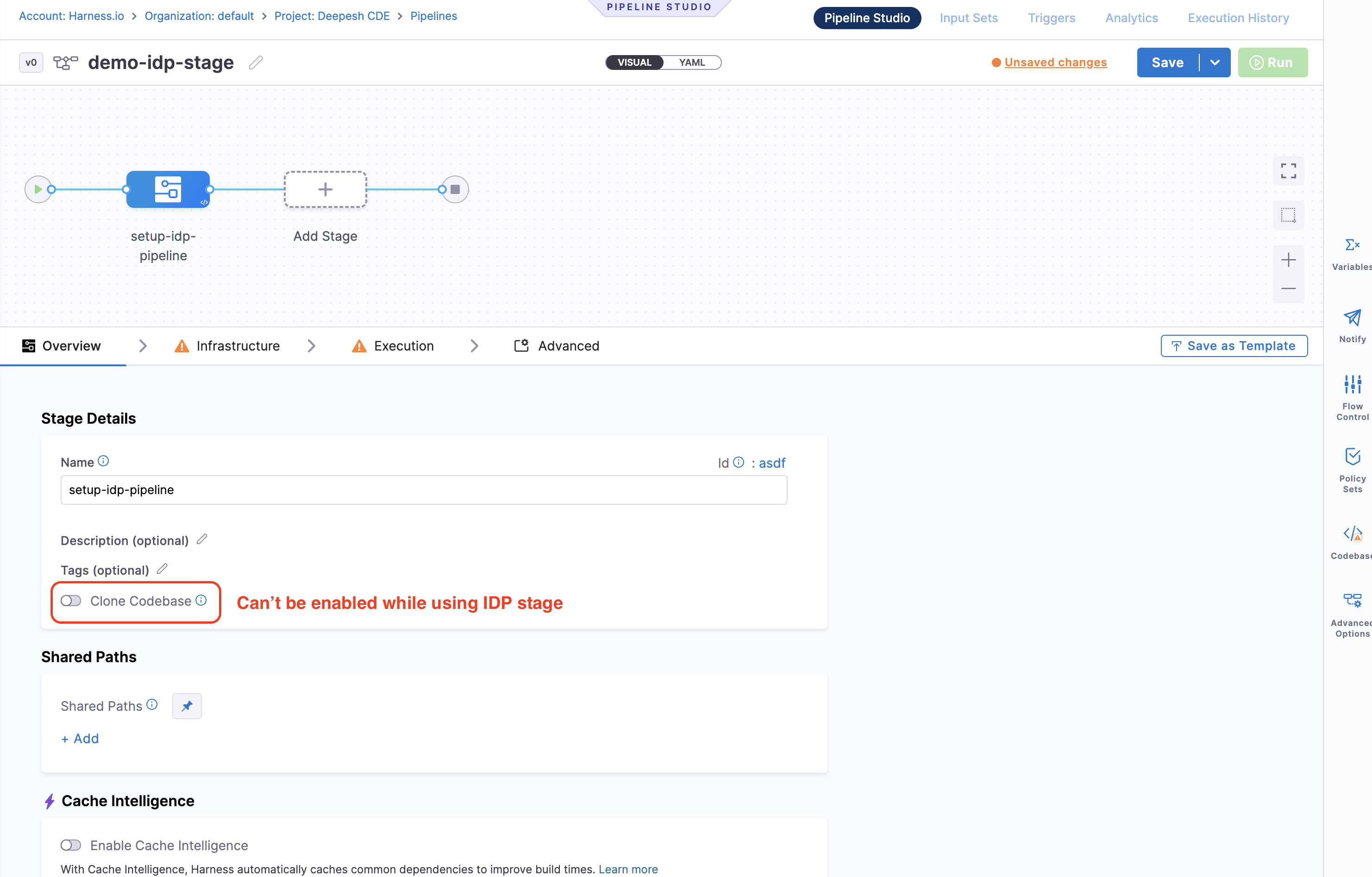 Harness IDP includes a native IDP Stage where all IDP-specific tasks required for pipeline execution are pre-configured as pipeline steps within the stage. This enables quick and efficient creation of self-service workflows.