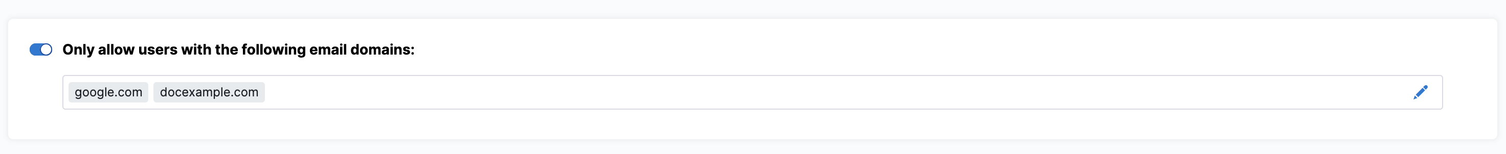 Select Only allow users with the following email domains: to allow (whitelist) only certain domains as usable in login credentials. In the dialog shown below, build your allowlist by simply typing your chosen domains into the Domains multi-select field.
