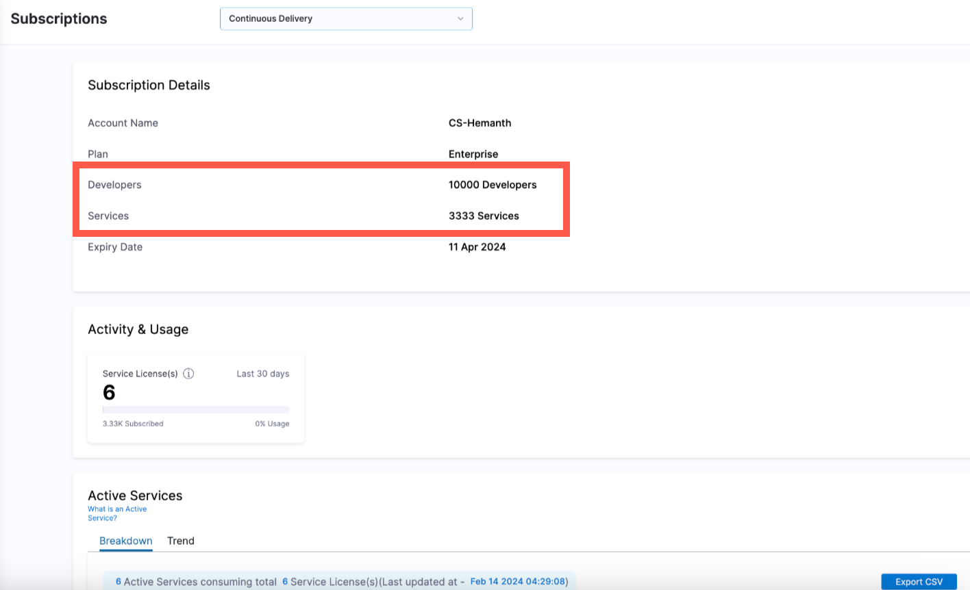 For Developer 360 module subscriptions, you can view your subscription details on the Subscriptions page. In your Harness account, go to Account Settings, then select Subscriptions.
