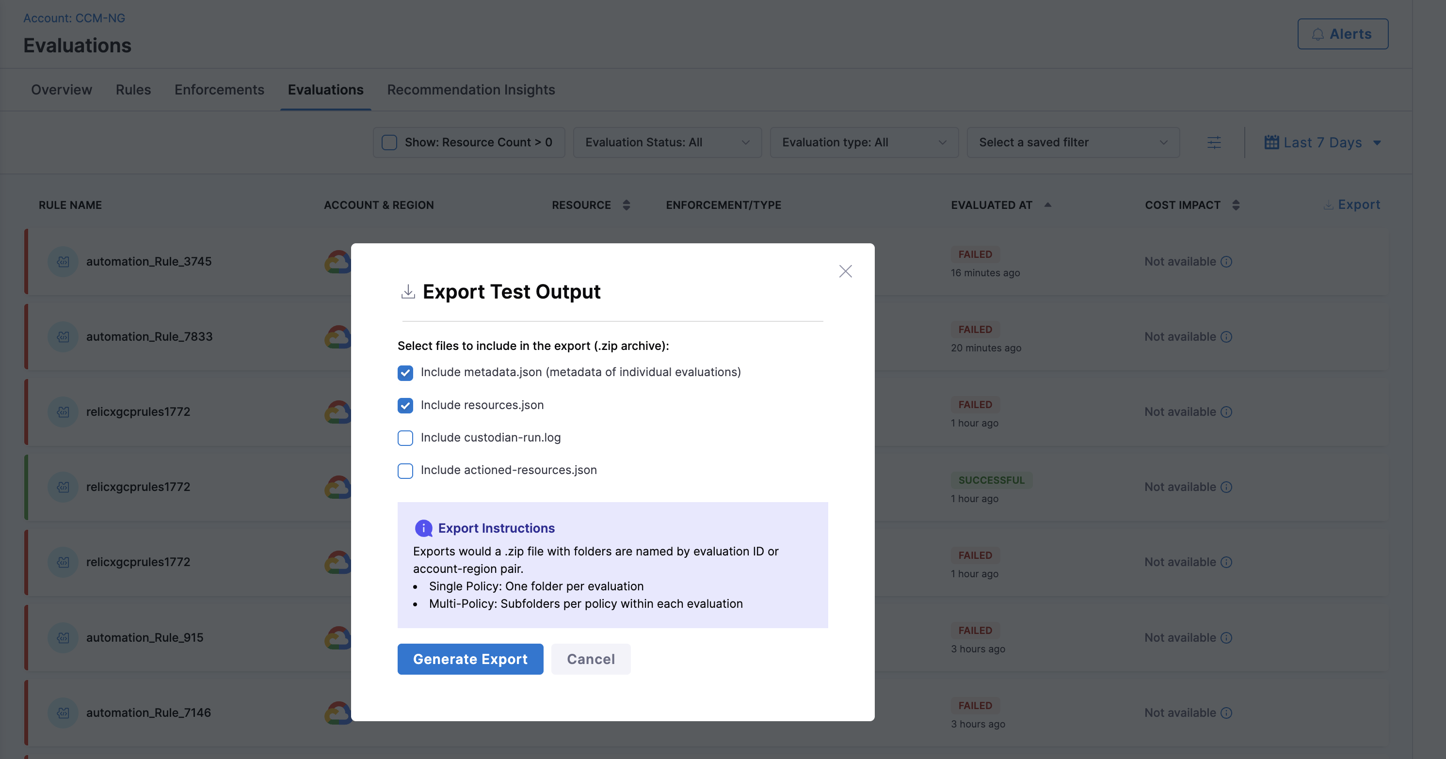 CCM has introduced a new "Export" option in Cloud Asset Governance that lets you easily download results and logs from multiple evaluations run across different accounts and regions directly from the Test Terminal (for multi-target evaluations) or the Evaluations page.
