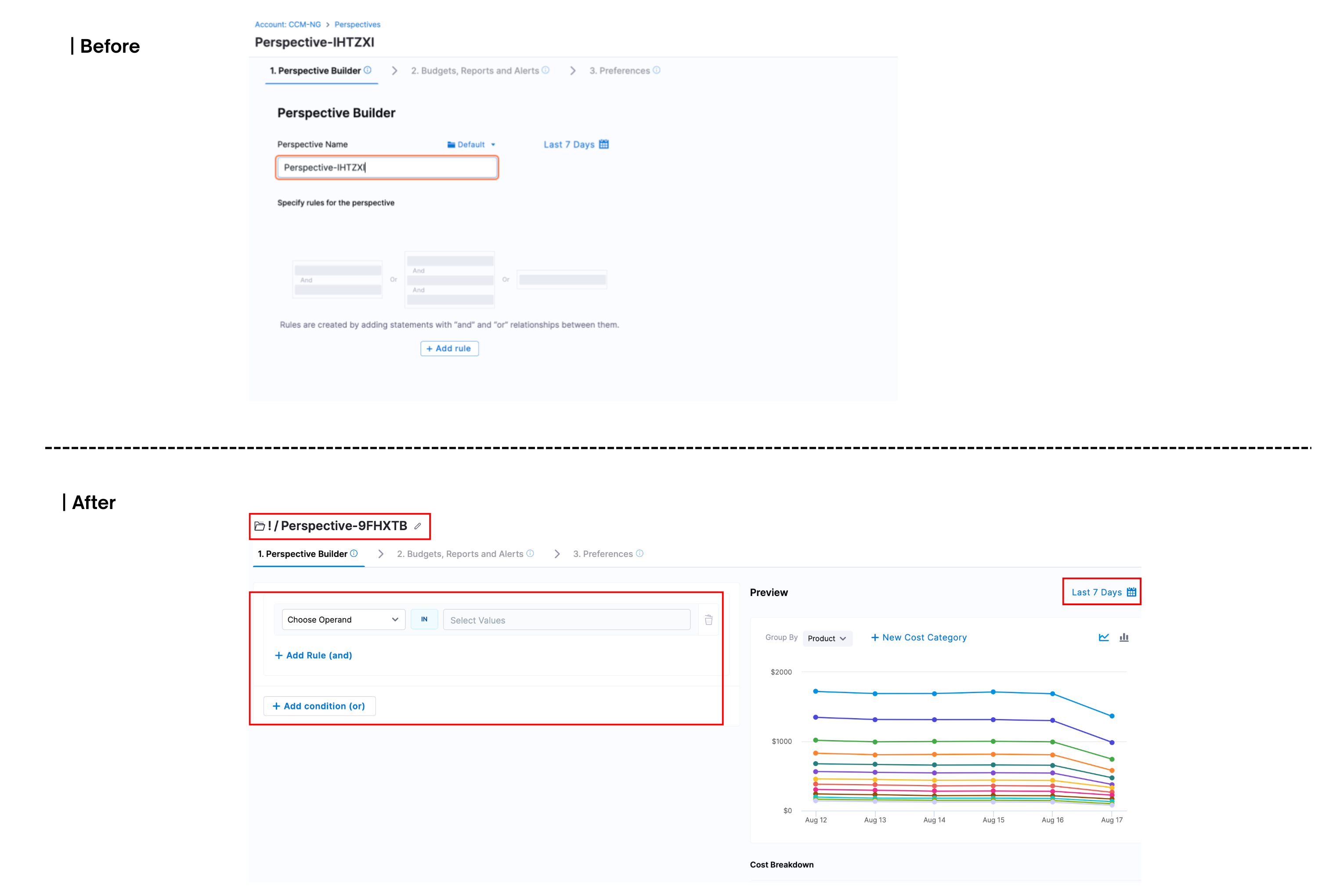 - Revamp Perspective Rule Builder UX: We’ve revamped the UX for the Perspective Rule builder. The time range selection in Perspective creation is now on the right side near the chart, and the Rule Name and Folder fields are moved into a separate modal. This updated rule builder is also used in Cost Categories. [CCM-24935]